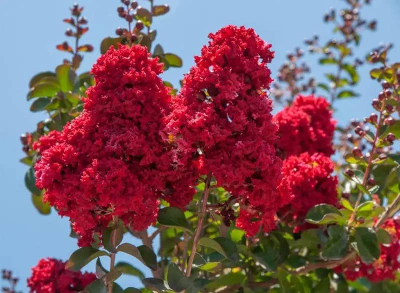 Эффектный сорт с ярко-алыми, пылающими соцветиями, которые создают ощущение живого огня в саду. Куст компактный, густо облиственный, высотой до 2 метров. Цветёт обильно и долго — с июня по октябрь.
